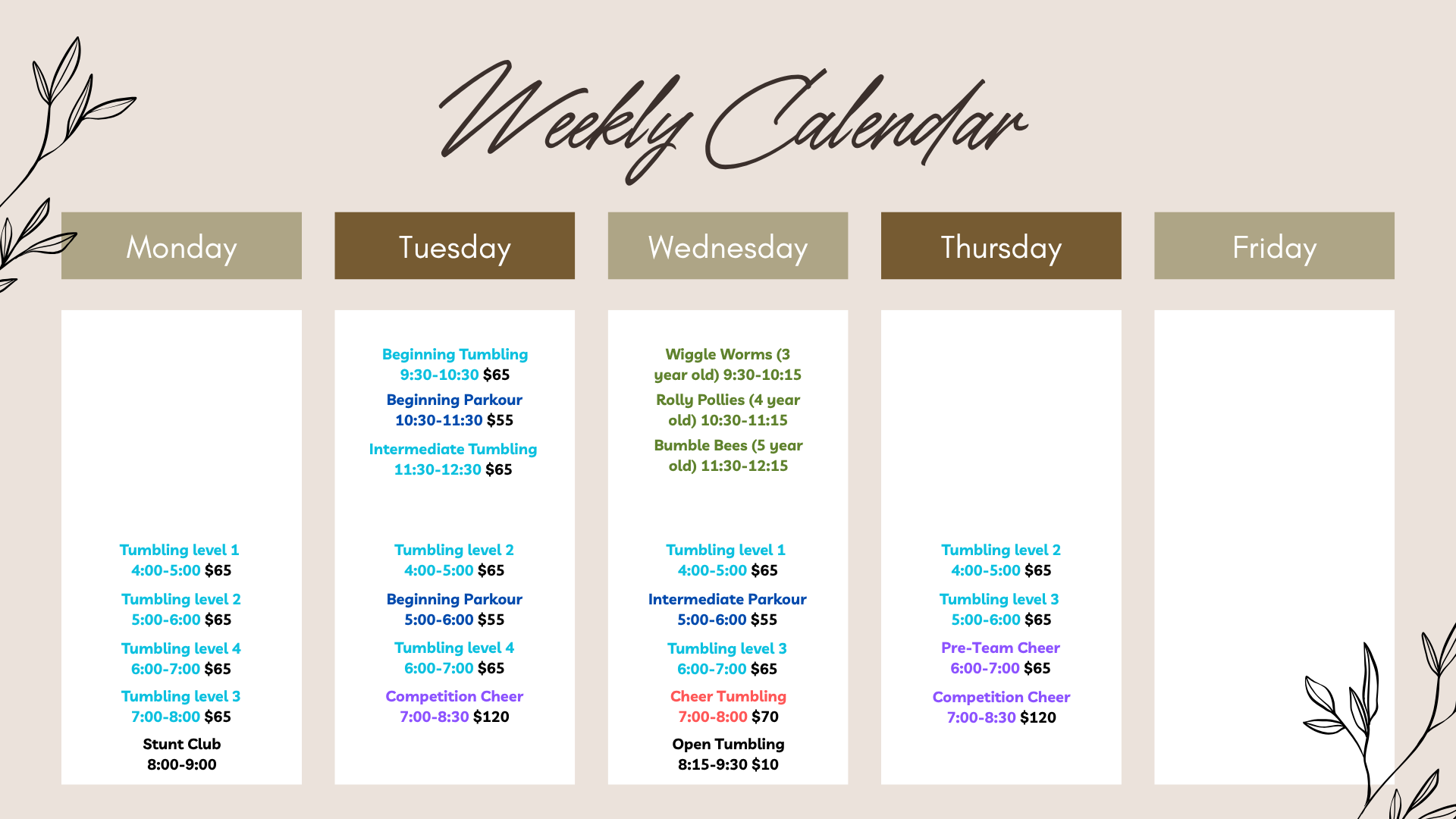 $65/month - Open to ages 6+, this class is a great way to learn the basics of cheerleading while learning the following skills:
